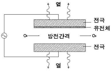 무성방전법은 전극사이에 유리나 세라믹 같은 유전체를 끼우고 공기나 산소를 불어넣고 전극에 고압(6kv~15kv)을 가하면 방전 공간에서 다음 반응에 의하여 오존이 발생된다.